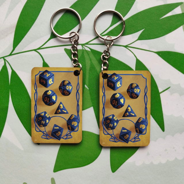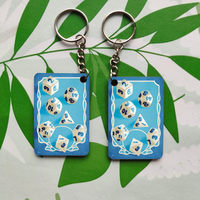 Porte-clés représentant des dés de jdr.