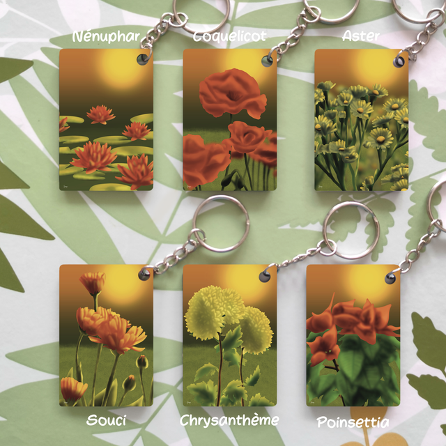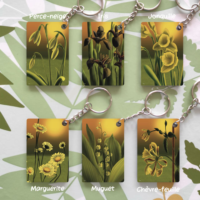 Illustration A4, porte-clés et marque-pages, représentant différentes fleurs, chacune représentant un mois de l’année.