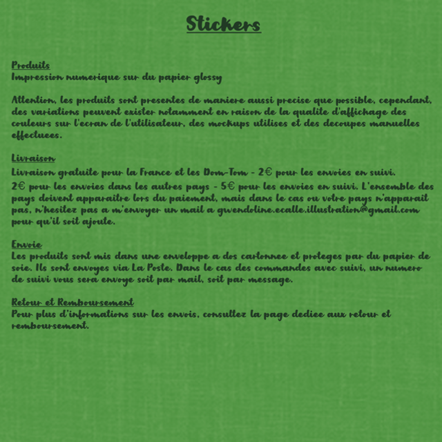 - Les produits sont envoyés dans une enveloppe à dos cartonnée et protégés par du papier de soie. Ils sont envoyés via La Poste. Dans le cas des commandes avec suivi, un numéro de suivi vous sera envoyé soit par mail, soit par message.