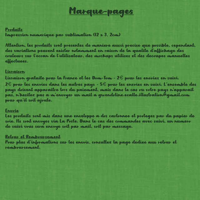- Attention, les produits sont présentés de manière aussi précise que possible, cependant, des variations peuvent exister notamment en raison de la qualité d'affichage des couleurs sur l'écran de l'utilisateur, des mockups utilisés et des découpes manuelles effectuées. - Livraison gratuite pour la France, Monaco et l’Outre-mer, 2€ avec suivi. A partir de 3€ pour l’international.